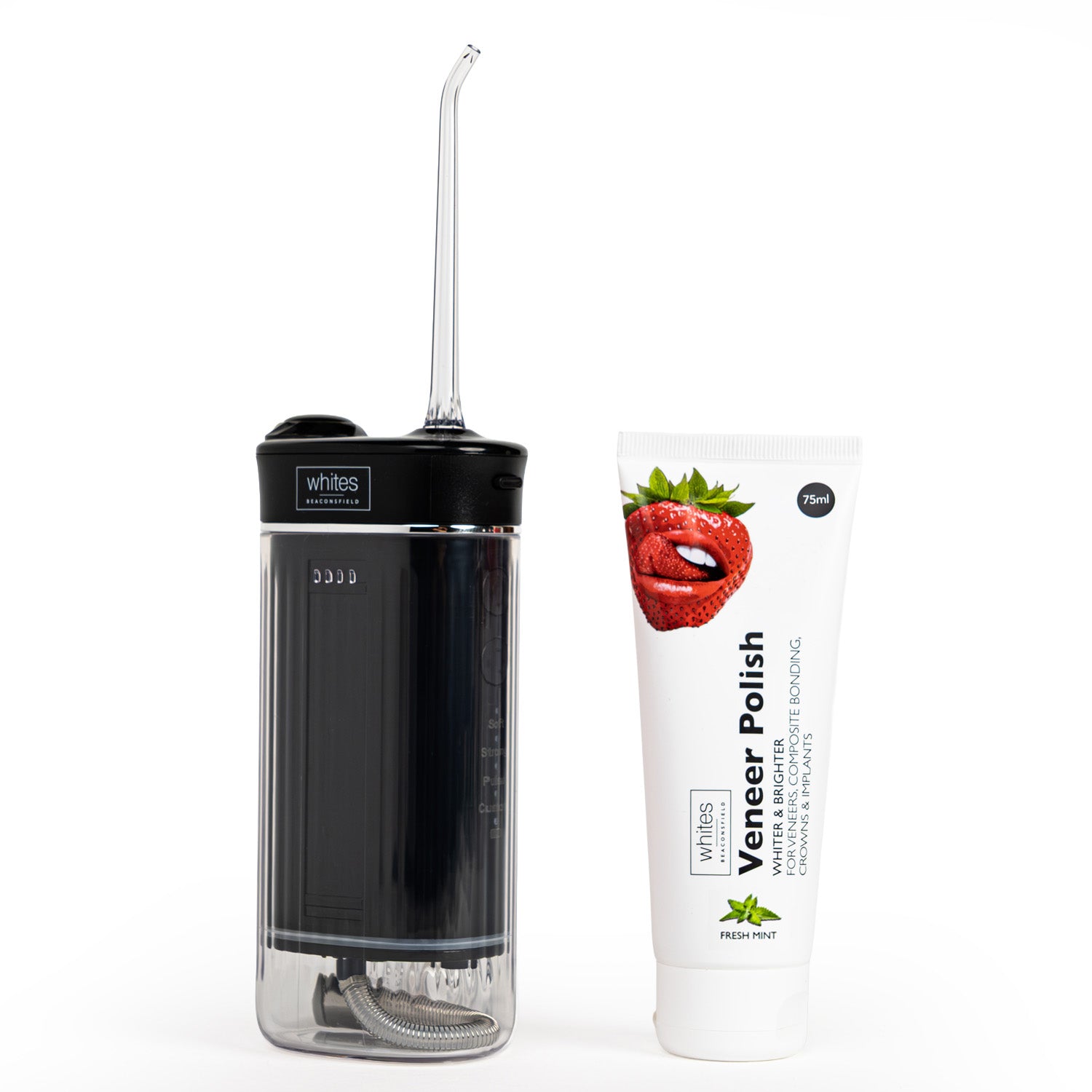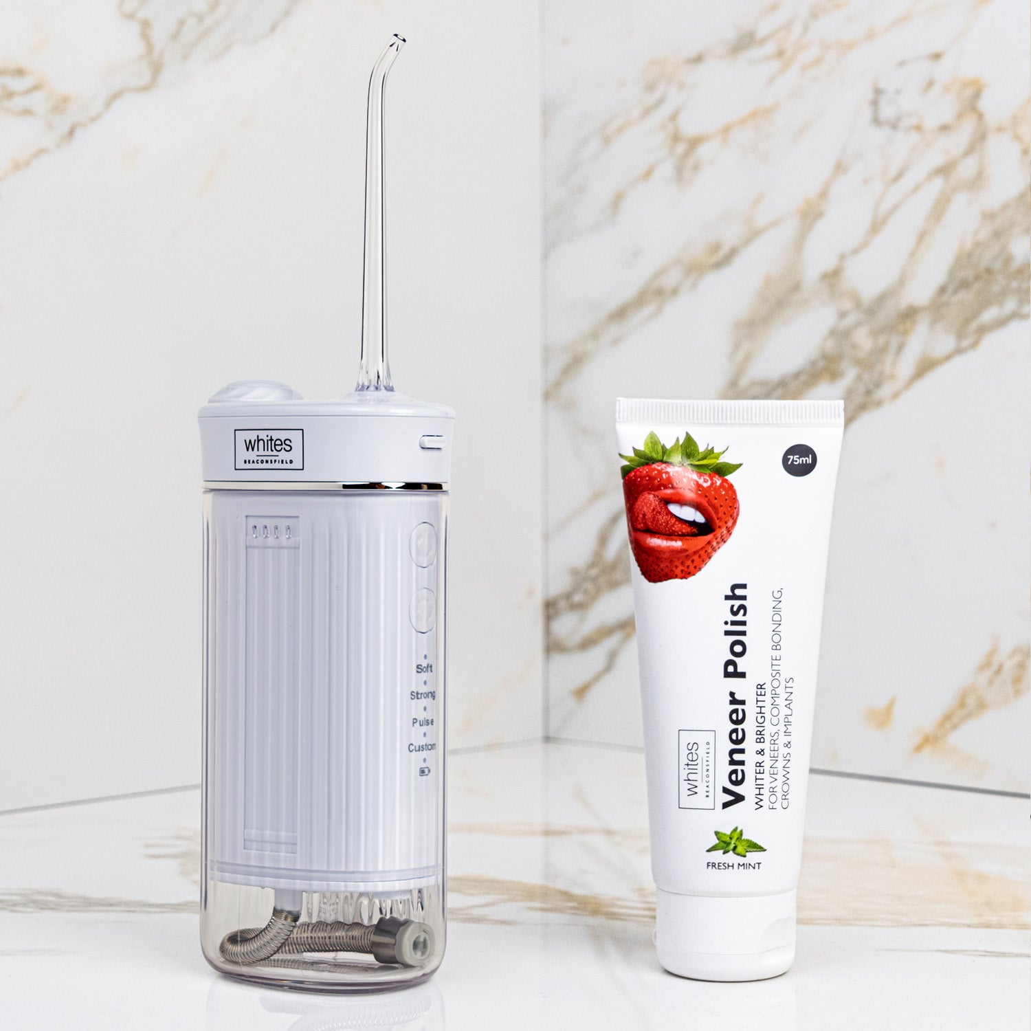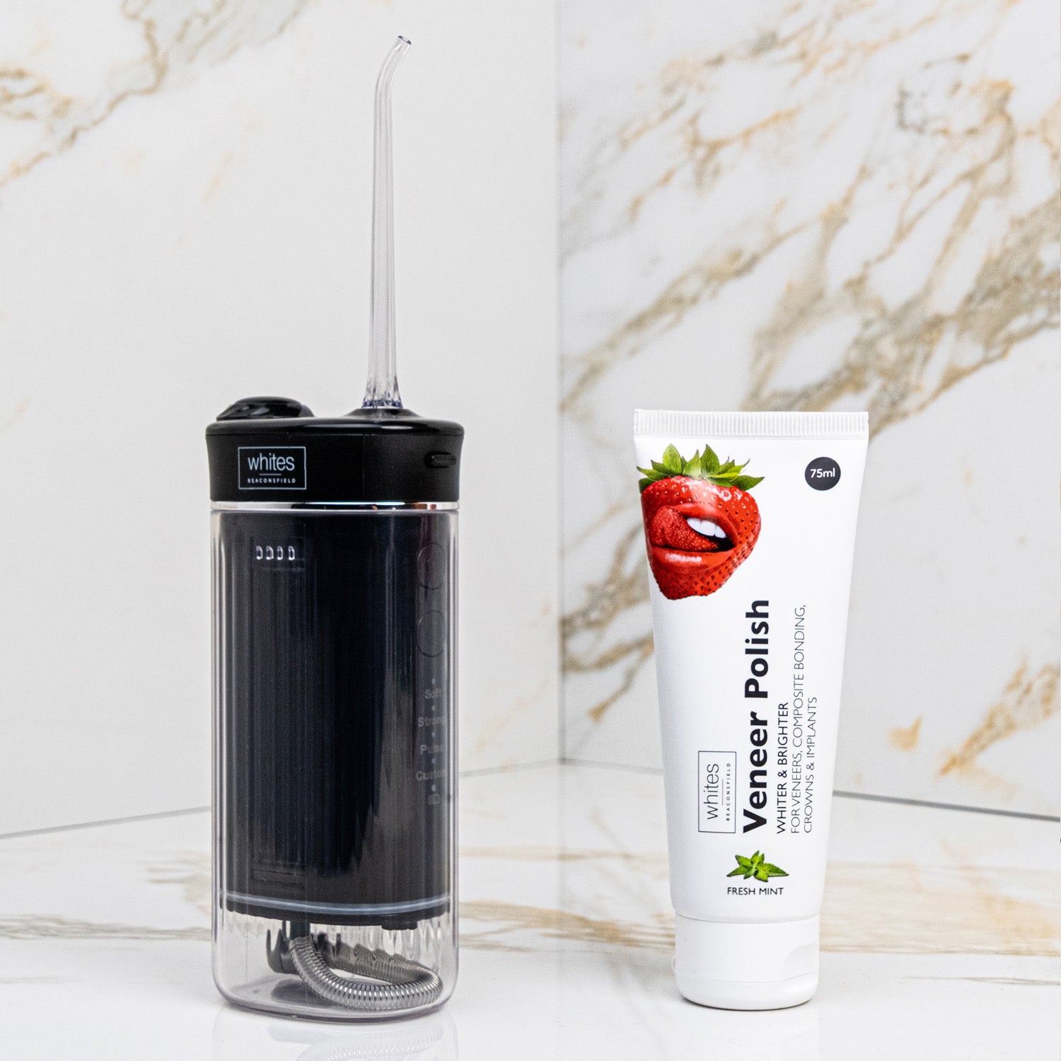 The water flosser tackles what's hiding beneath: plaque, debris, bacteria. The veneer polish brightens what everyone sees, safely removing surface stains whilst protecting your veneers and restorations. Perfect for anyone wanting both oral health and cosmetic shine, all in one seamless home routine.