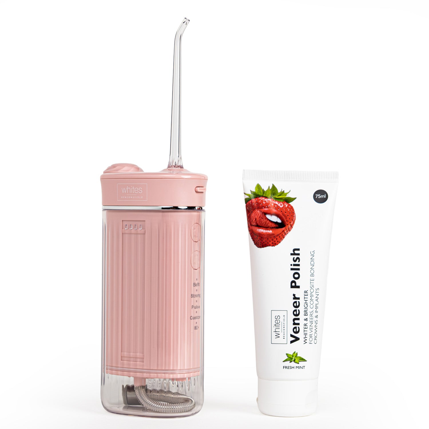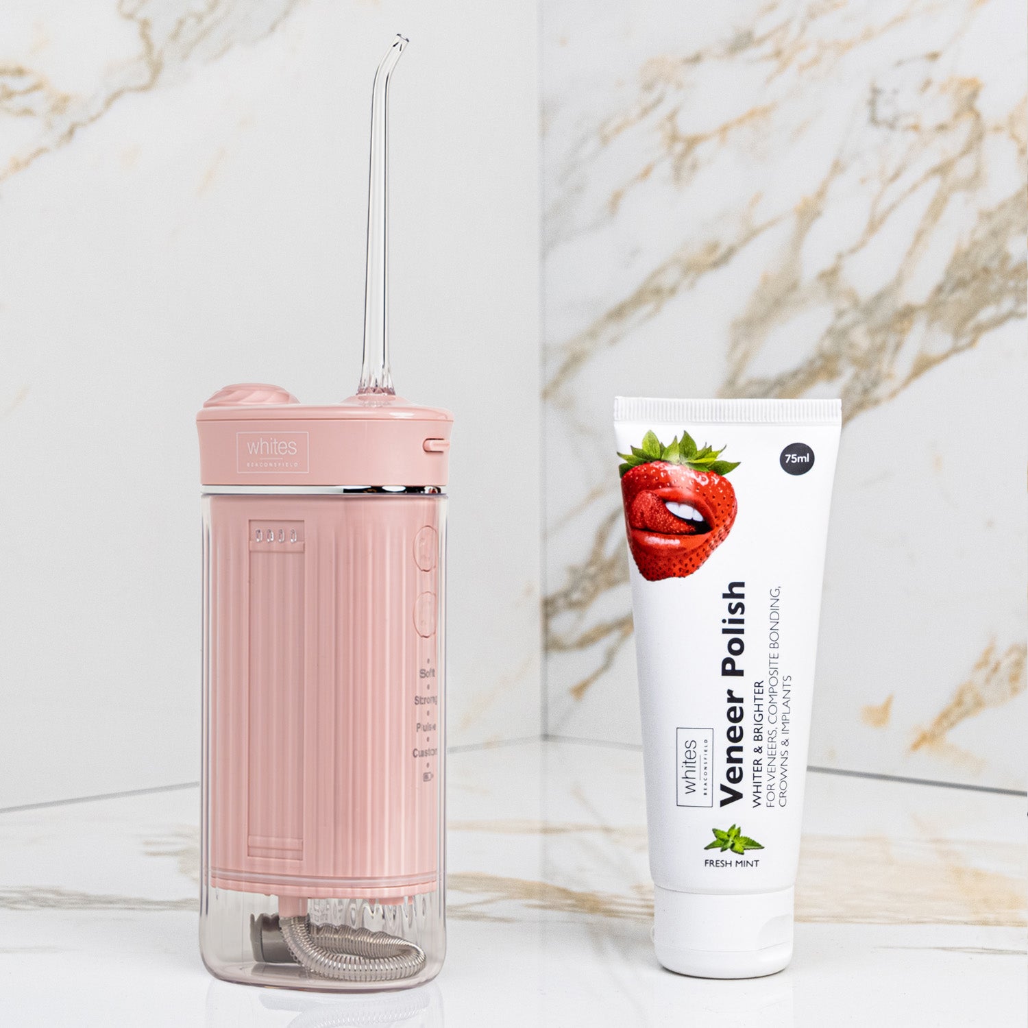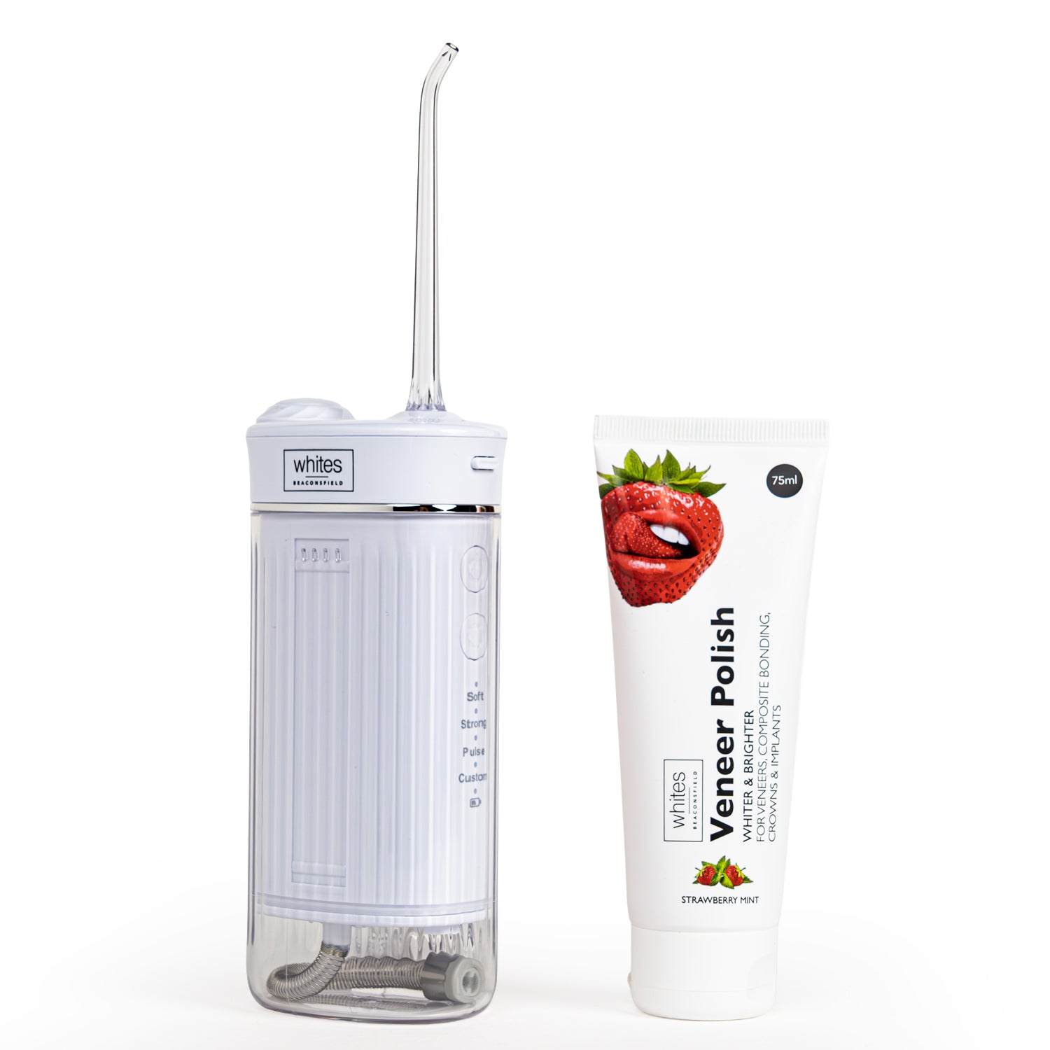 The water flosser tackles what's hiding beneath: plaque, debris, bacteria. The veneer polish brightens what everyone sees, safely removing surface stains whilst protecting your veneers and restorations. Perfect for anyone wanting both oral health and cosmetic shine, all in one seamless home routine.