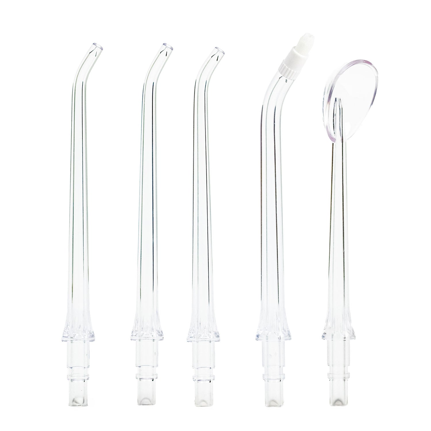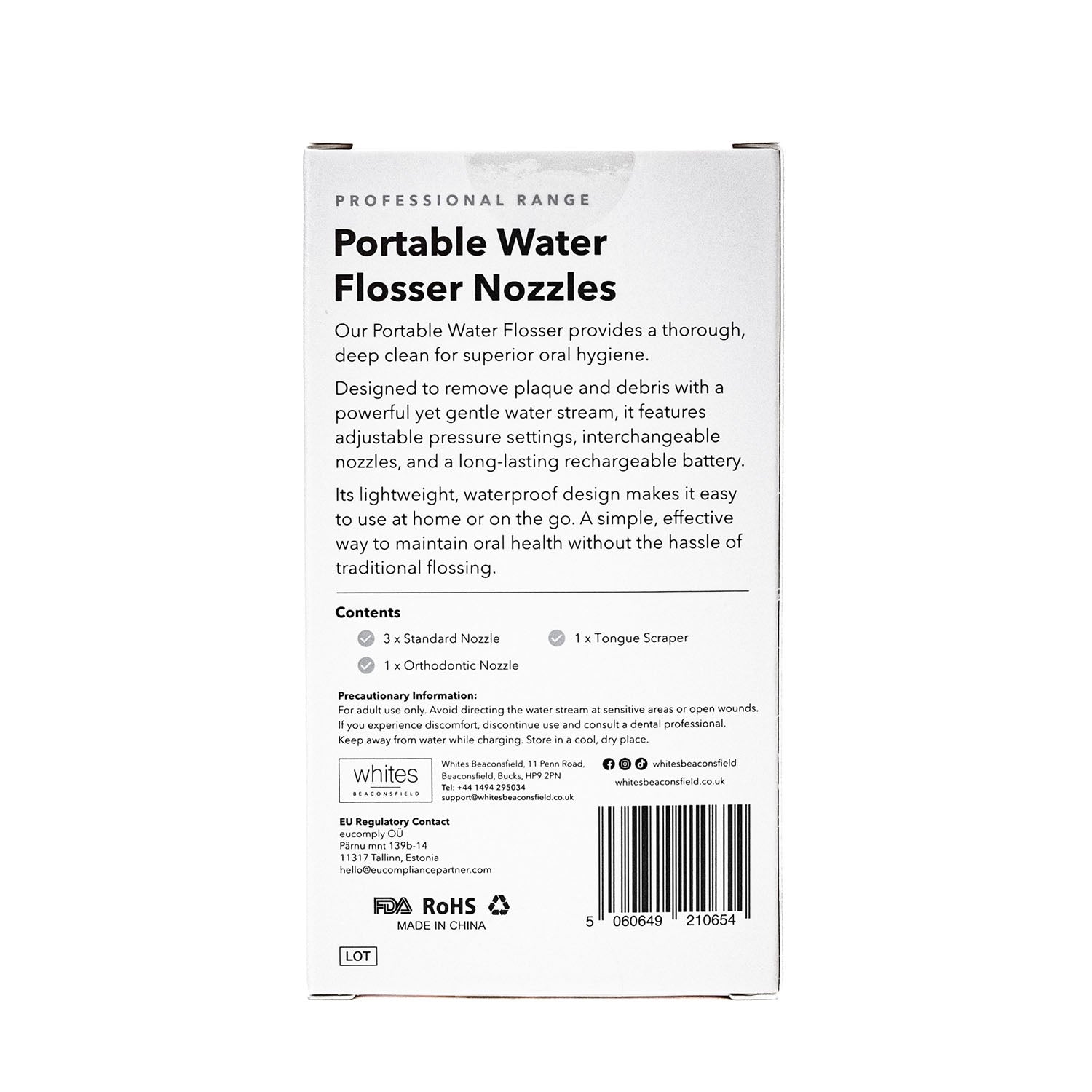 Each package contains 5 replacement nozzles, tailored for the Whites Portable Water Flosser. The set includes 3 standard nozzles, 1 orthodontic nozzle, and 1 tongue scraper nozzle. These nozzles are designed to ensure effective cleaning and maintenance of your water flosser.